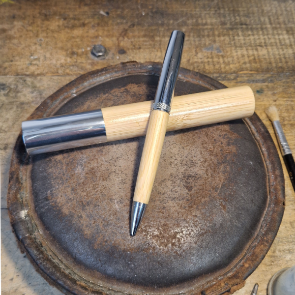 Eleganter Kugelschreiber aus Bambus mit passender Hülle. Umweltfreundlich, stilvoll & individuell gravierbar – ideal als Geschenk oder Werbegeschenk.